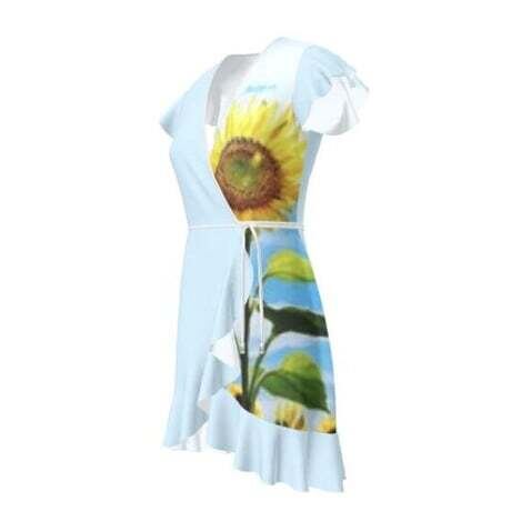 淡いブルーにおしゃれな向日葵の絵柄が施されたフレアスカートをご紹介します。